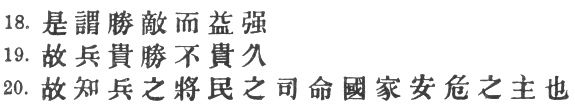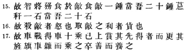 15:2 These are two difficult sentences, which I have translated in accordance with Mei Yao-ch‘ên's paraphrase. We may incontinently reject Capt. Calthrop's extraordinary translation of the first: "Wantonly to kill and destroy the enemy must be forbidden." Ts‘ao Kung quotes a jingle current in his day: #. Tu Mu says: "Rewards are necessary in order to make the soldiers see the advantage of beating the enemy; thus, when you capture spoils from the enemy, they must be used as rewards, so that all your men may have a keen desire to fight, each on his own account. Chang Yü takes # as the direct object of #; which is not so good.