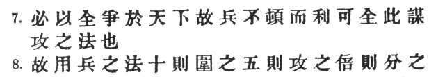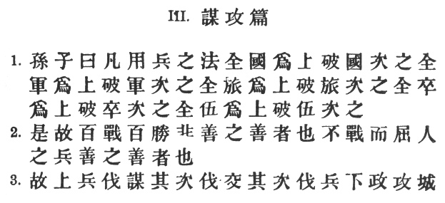 17:3 p. 18 I.e., as Li Ch‘üan says (#), in their very inception. Perhaps the word "baulk" falls short of expressing the full force of #, which implies not an attitude of defence, whereby one might be content to foil the enemy's stratagems one after another, but an active policy of counter-attack. Ho Shih puts this very clearly in his note: "When the enemy has made a plan of attack against us, we must anticipate him by delivering our own attack first."