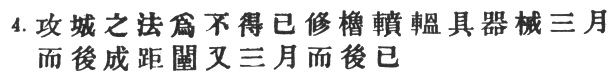 18:5 It is not quite clear what # were. Ts‘ao Kung simply defines them as # "large shields," but we get a better idea of them from Li Ch‘üan, who says they were to protect the heads of those who were assaulting the city walls at close quarters. This seems to suggest a sort of Roman testudo, ready made. Tu Mu says they were "what are now termed #" (wheeled vehicles used in repelling attacks, according to K‘ang Hsi), but this is denied by Ch‘ên Hao. See supra, II. 14. The name is also applied to turrets on city walls. Of # (fên yün) we get p. 19 a fairly clear description from several commentators. They were wooden missile-proof structures on four wheels, propelled from within, covered over with raw hides, and used in sieges to convey parties of men to and from the walls, for the purpose of filling up the encircling moat with earth. Tu Mu adds that they are now called # "wooden donkeys." Capt. Calthrop wrongly translates the term, "battering-rams." I follow Ts‘ao Kung in taking # as a verb, co-ordinate and synonymous with #. Those commentators who regard # as an adjective equivalent to # "long," make presumably # into a noun.