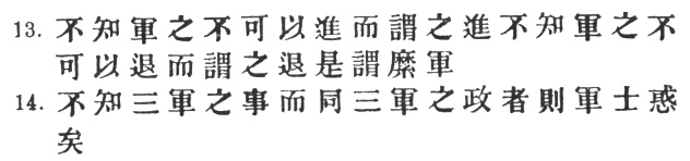 13. (1) By commanding the army to advance or to retreat, being ignorant of the fact that it cannot obey. This is called hobbling the army. 1