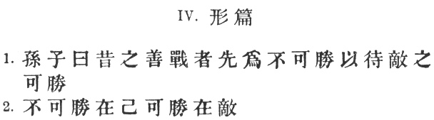 26:1 # is a very comprehensive and somewhat vague term. Literally, "form," "body," it comes to mean "appearance," "attitude" or "disposition;" and here it is best taken as something between, or perhaps combining, "tactics" and "disposition of troops." Ts‘ao Kung explains it as # "marching and countermarching on the part of the two armies with a view to discovering each other's condition." Tu Mu says: "It is through the# dispositions of an army that its condition may be discovered. Conceal your dispositions (#), and your condition will remain secret, which leads to victory; show your dispositions, and your condition will become patent, which leads to defeat." Wang Hsi remarks that the good general can # "secure success by modifying his tactics to meet those of the enemy." In the modern text, the title of the chapter appears as #, which Capt. Calthrop incorrectly translates "the order of battle."