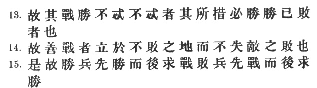 30:1 Ch‘ên Hao says: "He plans no superfluous marches, he devises no futile attacks." The connection of ideas is thus explained by Chang Yü: "One who seeks to conquer by sheer strength, clever though he may be at winning pitched battles, is also liable on occasion to be vanquished whereas he who can look into the future and discern conditions that are not yet manifest, will never make a blunder and therefore invariably win." Li Ch‘üan thinks that the character # should be # "to have doubts." But it is better not to tamper with the text, especially when no improvement in sense is the result.