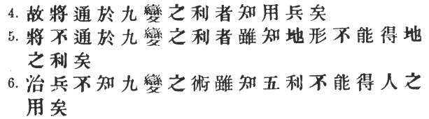71:1 The heading means literally "The Nine Variations," but as Sun Tzŭ does not appear to enumerate these, and as, indeed, he has already told us (V. §§ 6–11) that such deflections from the ordinary course are practically innumerable, we have little option but to follow Wang Hsi, who says that "Nine" stands for an indefinitely large number. "All it means is that in warfare # we ought to vary our tactics to the utmost degree … I do not know what Ts‘ao Kung makes these Nine Variations out to be [the latter's note is #], but it has been suggested that they are connected with the Nine Situations"—of chap. XI. This is the view adopted by Chang Yü: see note on #, § 2. The only other alternative is to suppose that something has been lost—a supposition to which the unusual shortness of the chapter lends some weight.