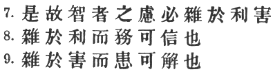 76:1 A translator cannot emulate the conciseness of # "to blend [thoughts of advantage] with disadvantage," but the meaning is as given. Tu Mu says: "If I wish to extricate myself from a dangerous position, I must consider not only the enemy's ability to injure me, but also my own ability to gain an advantage over the enemy. If in 'my counsels these two considerations are properly blended, I shall succeed in liberating myself … For instance, if I am surrounded by the enemy and only think of effecting an escape, the nervelessness of my policy will incite my adversary to pursue and crush me; it would be far better to encourage my men to deliver a bold counter-attack, and use the advantage thus gained to free myself from the enemy's toils." See the story of Ts‘ao Ts‘ao, VII. § 35, note. In his first edition, Capt. Calthrop translated §§ 7–9 as follows: "The wise man perceives clearly wherein lies advantage and disadvantage. While recognising an opportunity, he does not overlook the risks, and saves future anxiety." This has now been altered into: "The wise man considers well both advantage and disadvantage. He sees a way out of adversity, and on the day of victory to danger is not blind." Owing to a needless inversion of the Chinese, the words which I have italicised are evidently intended to represent § 8!