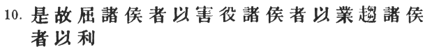 76:2 Chia Lin enumerates several ways of inflicting this injury, some of which would only occur to the Oriental mind:—"Entice away the enemy's best and wisest men, so that he may be left without counsellors. Introduce traitors into his country, that the government policy may be rendered futile. Foment intrigue and deceit, and thus sow dissension between the ruler and his ministers. By means of every artful contrivance, cause deterioration amongst his men and waste of his treasure. Corrupt his morals by insidious gifts leading him into excess. Disturb and unsettle his mind by presenting him with lovely women." Chang Yü (after Wang Hsi) considers the # to be military chastisement: "Get the enemy," he says, "into a position where he must suffer injury, and he will submit of his own accord." Capt. Calthrop twists Sun Tzŭ's words into an absurdly barbarous precept: "In reducing an enemy to submission, inflict all possible damage upon him."