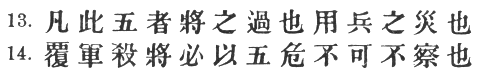 74:3 p. 75 Ts‘ao Kung says that the # are # "the five things that follow;" but this cannot be right. We must rather look back to the five "variations" contained in § 3. Chia Lin (who reads # here to balance the #) tells us that these imply five obvious and generally advantageous lines of action, namely: "if a certain road is short, it must be followed; if an army is isolated, it must be attacked; if a town is in a parlous condition, it must be besieged; if a position can be stormed, it must be attempted; and if consistent with military operations, the ruler's commands must be obeyed." But there are circumstances which sometimes forbid a general to use these advantages. For instance, "a certain road may be the shortest way for him, but if he knows that it abounds in natural obstacles, or that the enemy has laid an ambush on it, he will not follow that road. A hostile force may be open to attack, but if he knows that it is hard-pressed and likely to fight with desperation, he will refrain from striking," and so on. Here the # comes in to modify the #, and hence we see the uselessness of knowing the one without the other—of having an eye for weaknesses in the enemy's armour without being clever enough to recast one's plans on the spur of the moment. Capt. Calthrop offers this slovenly translation: "In the management of armies, if the art of the Nine Changes be understood [sic], a knowledge of the Five Advantages is of no avail."