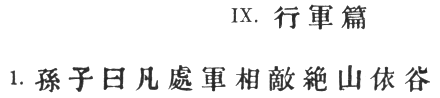 98:4 The original text has #. # is certainly awkward without #, but on the other hand it is clear that Tu Mu accepted the T‘ung Tien text, which is identical with ours. He says: "A general ought p. 99 in time of peace to show kindly confidence in his men and also make his authority respected, so that when they come to face the enemy, orders may be executed and discipline maintained, because they all trust and look up to him." What Sun Tzŭ has said in § 44, however, would lead one rather to expect something like this: "If a general is always confident that his orders will be carried out," etc. Hence I am tempted to think that he may have written #. But this is perhaps too conjectural.