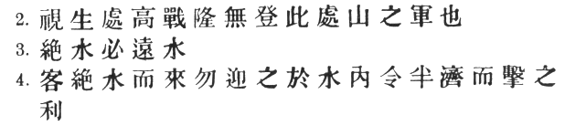84:2 Those, namely, concerned with (1) mountains, (2) rivers, (3) marshes, and (4) plains. Compare Napoleon's "Military Maxims," no. 1.