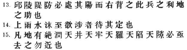 83:2 Li Ch‘üan remarks that the ground is less likely to be treacherous where there are trees, while Tu Yu says that they will serve to protect the rear. Capt. Calthrop, with a perfect genius for going wrong, says "in the neighbourhood of a marsh." For # the T‘ung Tien and Yü Lan wrongly read #, and the latter also has # instead of #.