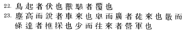 91:1 I follow the original text here, also adopted by the T‘u Shu. The standard text reads # on the strength of Ts‘ao Kung's commentary #, which shows that his text included the word #. Strong as this ground is, I do not think it can counterbalance the obvious superiority of the other reading in point of sense. # not only provides no antithesis to #, but makes the whole passage absurd; for if the language of the enemy is calculated to deceive, it cannot be known as deceitful at the time, and can therefore afford no "sign." Moreover, the extra word in # (an awkward locution, by the way) spoils the parallelism with #.