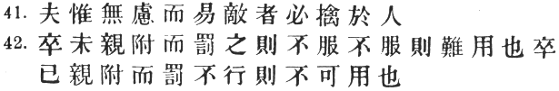 98:2 # and #, according to Ts‘ao Kung, are here equivalent to # and # respectively. Compare our two uses of the word "civil." Yen Tzŭ [† B.C. 493] said of # Ssŭ ma Jang-chü: # "His civil virtues endeared him to the people; his martial prowess kept his enemies in awe." Cf. Wu Tzŭ, ch. 4 init.: # "The ideal commander unites culture with a warlike temper; the profession of arms requires a combination of hardness and tenderness." Again I must find fault with Capt. Calthrop's translation: "By humane treatment we obtain obedience; authority brings uniformity."