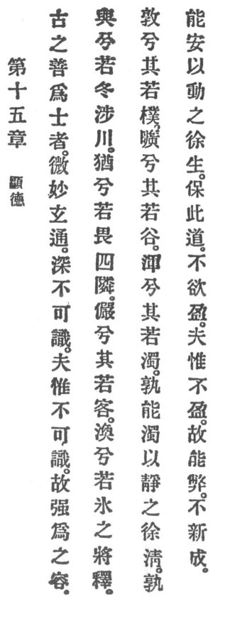 2. How cautious they are! Like men in winter crossing a river. How reluctant! Like men fearing in the four quarters their neighbors. How reserved! They behave like guests. How elusive! They resemble ice when melting. How simple! They resemble rough wood. p. 83 How empty! They resemble the valley. How obscure! They resemble troubled waters.