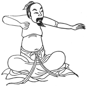 5.—Third Month,—Solar Term "Pure Brightness."—Change hands right and left, like drawing the bow, each 7 × 8 times, knock the teeth, respire, taking in the outside pure air to displace the foul air from within, and swallow the saliva each 3 times. To cure the weakness and vicious air of the loins, kidneys, intestines, and stomach, painful deglutition, ears deaf .and painful, pain of the neck and inability to turn it, pain in the shoulder and unable to raise it, body bent and without strength, arm painful, and weakness of the loins.—See Figure, below. *