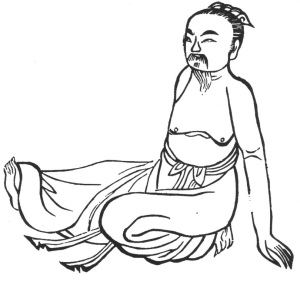 11.—For the Solar Term of the Sixth Month, named "Slight Heat."—Press the two hands to the ground, bend one foot under the body, stretch out the other with force 3 × 5 times, etc. To cure rheumatism (wind and dampness) of the legs, knees, thighs, and loins, fulness of the lungs with excessive flow of phlegm, asthma, cough, pain in the middle of the sternum, violent sneezing, abdominal distension and pain to the right of the navel, the hands contracted (bent crooked), body heavy, hemiplegia, loss of memory, whooping cough, prolapsus ani, weakness of wrist, joy and anger inconstant. (See Figure). Corresponds with Amiot's No. 12, against paralysis of certain members, short and precipitate respiration, pains of the lower belly with tension.