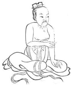 20.—For the Middle of the Tenth Month, termed "Slight Snow."—One hand placed on the knee, the other grasping the elbow, right and left using force 3 × 5 times, etc. To cure wind, damp, and warm poison of the wrist and elbow, a wife's enlargement of the small abdomen and a husband's hernia, fox (?) hernia (all sorts of hernia), incontinence of urine, swelling of the joints, contraction of tendons, small membrum virile, five sorts of gonorrhœa (wind, fire, cold, poison, damp), diarrhœa, fear, fulness of the chest, asthma of the lower ribs. (See Figure).