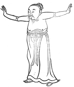 21.—For the Solar Term of the Eleventh Month, named "Great Snow."—Standing straight, the knees extended, both hands to the right and left as if supporting the two feet, right and left stamping, each 5 × 7 times, etc. To cure wind and dampness of the feet and knees, heat of the mouth, dryness of the tongue, swelling of the throat, jaundice, hungry, and cannot eat, cough, hæmoptysis, asthma, vision indistinct, fear (as if about to be seized).—See Figure.