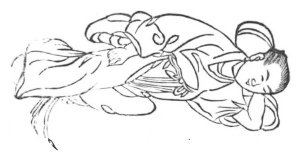 Lie with the left hand for a pillow, rub the abdomen with the right fist, flex the right foot a little, press the right leg upon the left a little, and as if sleeping in this manner inspire 32 mouthfuls, and move the air round in 12 mouthfuls.