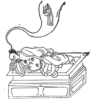The tiger is here placed on the right, the dragon on the left. In the sleeping exercise for the right side (see illustration), the liver occupies the right and the lungs the left side, with two of the Eight Diagram figures, Li and K‘an (fire and water respectively), above and below, and Hu in the middle, and the whole stanza reads:—