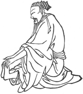 Sit on one side, use the pair of hands to take hold of the soles of the two feet, first take hold of the left sole and rub it warm, and revolve the air 9 times. Afterwards do the same with the right sole, and perform the kung like the left.