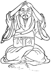 Sit upright, rub the two hands warm and embrace the vertex door (anterior fantanelle), shut the eyes to prevent the animal spirits from being dissipated, blow, hem, and drum the air to cause it to ascend to the top of the vertex; revolve the air 17 times.