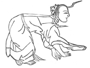 Bend the arms as if prostrating one's self to do obeisance; cross the hands and feet, crawl along on the ground, practise the kung right and left, and revolve the air each in 12 mouthfuls.