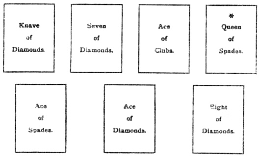 We notice that three aces come out in this pack and show passing troubles in love affairs. The knave of diamonds, an unfaithful friend, is mixed up in scandal, the seven of diamonds, conveyed in a letter, the ace of clubs, written or instigated by the spiteful widow, the queen of spades. The ace of spades betokens sickness, but it is followed by the ace of diamonds, the wedding ring, and the pack closes with the eight of diamonds, telling of a happy marriage for the inquirer after all his worries.