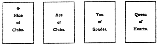 "The Surprise" is very closely connected with the inquirer herself, for we find her included in the four cards. There are the ace of hearts, the queen of clubs, the nine of diamonds, and the seven of diamonds. From this we gather that there is a love letter for the inquirer, which, however, may be delayed by some cross accident, and she will thus be exposed