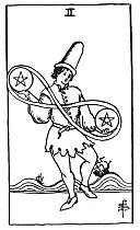 THEORY: The Fire on the Sixth house, the house of Virgo. Now here the so-called reversed meanings in the tradition seem to hold the most current significances of this house. Which once more warns us against attaching too great, if any, importance to the idea of 'reversed' position. The tradition does not give a very clear conception here, on the whole. The word 'emotion' is not in its place; as to embarrassment, this is correct: the influence of the sunny and Venusian fire on this house of infinite possibilities must naturally cause 'embarras du choix,' the difficulty of choice, and the one possibility hindering the other; giving too much force and attention to little or subordinate things and persons. There can be very little harm, however, in any card of the pentacles suit; the greatest evil done here might be that too little profit is earned in proportion to the labour given to it. On the other hand this card must necessarily mean good and conscientious work and fidelity of servants, agreeable and satisfactory work, reasonable remuneration, and consequently joy. The agreeable stimulation which it gives to the nervous system must cause gaiety, recreation, etc. Good health is also one of the results.