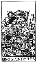 The King is the higher octave of the ace, and this particular king heads the cross of fixed signs, so has to do with economy, agriculture, art, vast business, devotional service of the church. The general effect of this card must consequently be to afford protection, and as it shows a very favourable attitude on the part of superiors or influential people, though these will be rather young, or at least, not very old. There is above all noblesse in this card, integrity, honesty above all doubt, nor is anything in it which can be turned to evil, were it thrice reversed. The only sort of faults that could be observed in people coming under it would be pride coupled with some vanity, love of pomp, gambling. The Leo-type will naturally dominate the card. Here is a man whom you must go to see and visit, because he will never come to you. He has a widespread influence, which is for the good of everybody who wishes to profit by it, and against which it is hopeless to contend. The card means further everything in the way of sanction,