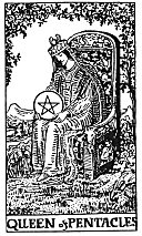 TRADITION: Dark woman, who suggests "the idea of greatness of soul; she has also the serious cast of intelligence." (W.) Opulence, riches, luxury, assurance (insurance?), security, liberty, frankness. Reversed: Doubt, indecision, uncertainty, timidity, apprehension, vacillation, etc.