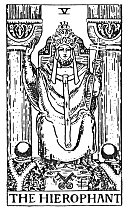 He wears the triple crown and is seated between two pillars, but they are not those of the Temple which is guarded by the High Priestess. In his left hand he holds a sceptre terminating in the triple cross, and with his right hand he gives the well-known ecclesiastical sign which is called that of esotericism, distinguishing between the manifest and concealed part of doctrine. It is noticeable in this connexion that the High Priestess makes no sign. At his feet are the crossed keys, and two priestly ministers in albs kneel before him. He has been usually called the Pope, which is a particular application of the more general office that he symbolizes. He is the ruling power of external religion, as the High Priestess is the prevailing genius of the esoteric, withdrawn power. The proper meanings of this card have suffered woeful admixture from nearly all hands. Grand Orient says truly that the Hierophant is the power of the keys, exoteric orthodox doctrine, and the outer side of the life which leads to the doctrine; but he is certainly not the prince of occult doctrine, as another commentator has suggested.