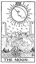 The distinction between this card and some of the conventional types is that the moon is increasing on what is called the side of mercy, to the right of the observer. It has sixteen chief and sixteen secondary rays. The card represents life of the imagination apart from life of the spirit. The path between the towers is the issue into the unknown. The dog and wolf are the fears of the natural mind in the presence of that place of exit, when there is only reflected light to guide it.
