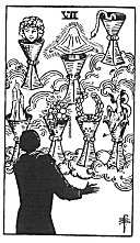 Strange chalices of vision, but the images are more especially those of the fantastic spirit. Divinatory Meanings: Fairy favours, images of reflection, sentiment, imagination, things seen in the glass of contemplation; some attainment in these degrees, but nothing permanent or substantial is suggested. Reversed: Desire, will, determination, project.