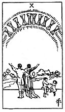 Appearance of Cups in a rainbow; it is contemplated in wonder and ecstacy by a man and woman below, evidently husband and wife. His right arm is about her; his left is raised upward; she raises her right arm. The two children dancing near them have not observed the prodigy but are happy after their own manner. There is a home-scene beyond. Divinatory Meanings: Contentment, repose of the entire heart; the perfection of that state; also perfection of human love and friendship; if with several picture-cards, a person who is taking charge of the Querent's interests; also the town, village or country inhabited by the Querent. Reversed: Repose of the false heart, indignation, violence.