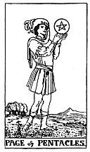 A youthful figure, looking intently at the pentacle which hovers over his raised hands. He moves slowly, insensible of that which is about him. Divinatory Meanings: Application, study, scholarship, reflection another reading says news, messages and the bringer thereof; also rule, management. Reversed: Prodigality, dissipation, liberality, luxury; unfavourable news.