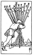 A man oppressed by the weight of the ten staves which he is carrying. Divinatory Meanings: A card of many significances, and some of the readings cannot be harmonized. I set aside that which connects it with honour and good faith. The chief meaning is oppression simply, but it is also fortune, gain, any kind of success, and then it is the oppression of these things. It is also a card of false-seeming, disguise, perfidy. The place which the figure is approaching may suffer from the rods that he carries. Success is stultified if the Nine of Swords follows, and if it is a question of a lawsuit, there will be certain loss. Reversed: Contrarieties, difficulties, intrigues, and their analogies.