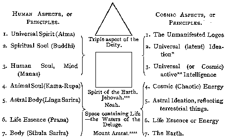 [[Continued from previous page]] three aspects, or adjunct principles out of calculation, they accept only four Upadhis (bases) including the Ego -- the reflected image of the Logos in the "Karana Sarira" -- and even "strictly speaking . . . . only three Upadhis." For purely theoretical metaphysical philosophy, or purposes of meditation, these three may be sufficient, as shown by the Taraka Yoga system; but for practical occult teaching our septenary division is the best and easiest. It is, however, a matter of school and choice.