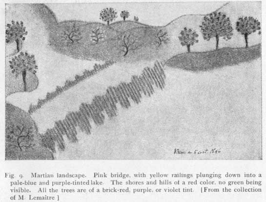 Fig. 9. Martian landscape. Pink bridge, with yellow railings plunging down into a pale-blue and purple-tinted lake. The shores and hills of a red color, no green being visible. All the trees are of a brick-red purple, or violet tint. [From the collection of M. Lemaître] |