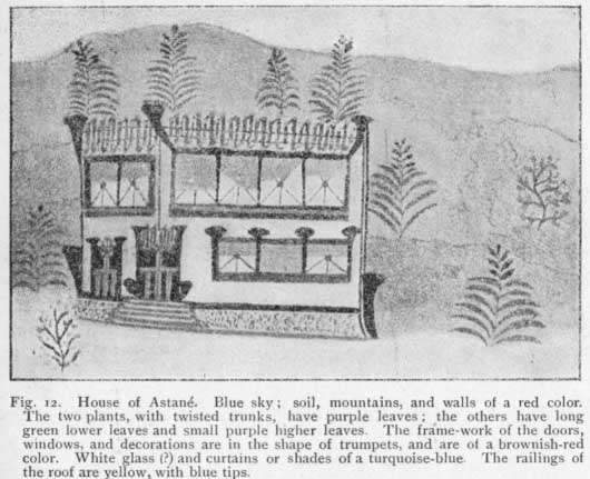 Fig. 12. House of Astané. Blue sky; soil, mountains, and walls of a red color. The two plants, with twisted trunks, have purple leaves; the others have long green lower leaves and small purple higher leaves. The frame-work of the doors, windows, and decorations are in the shape of trumpets, and are of a brownish-red color. White glass (?) and curtains or shades of a turquoise-blue. The railings of the roof are yellow, with blue tips. |