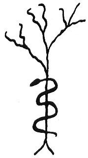 The serpent and the staff are symbols of Aesculapius, Roman god of medicine and Asklepios, Greek god of healing. The staff represented this god's wanderings from place to place dispensing cures.