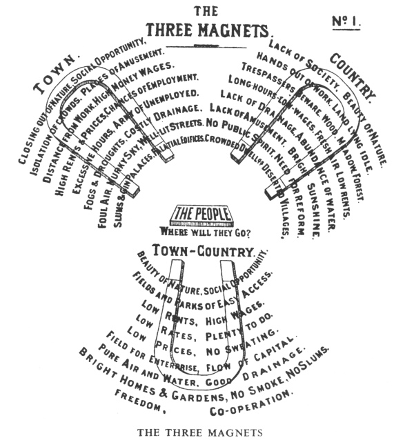 by a diagram of 'The Three Magnets', in which the chief advantages of the Town and of the Country are set forth with their corresponding drawbacks, while the advantages of the Town-Country are seen to be free from the disadvantages of either.
